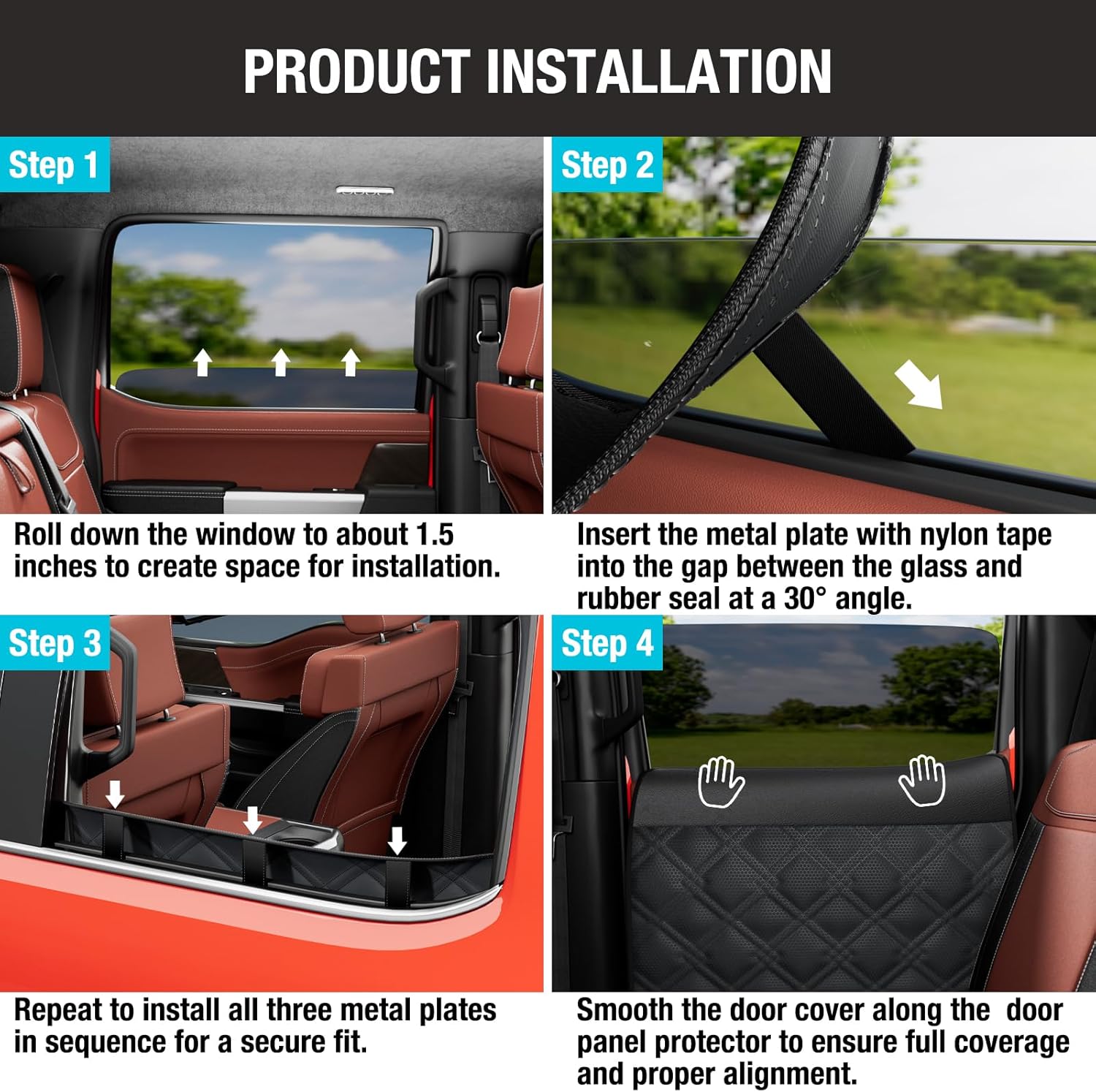 Sturdy metal inserts: Say goodbye to loose suction cups, Velcro, or plastic clips. Each car door protector features three L-shaped metal inserts covered with nylon tape that smoothly slide in window frame gaps without damaging glass or interfering with window operation.