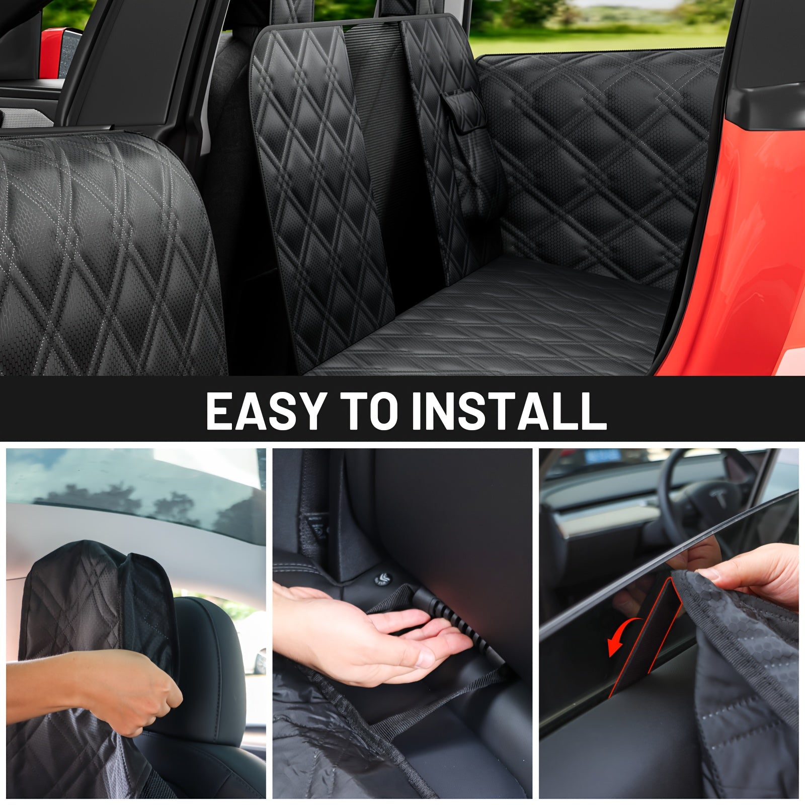 4-in-1 Multifunctional Design: Car rear seat protector + SUV pet-proof mat + Mesh window + Door panel protector. The door panel protector features a detachable design from the Model Y seat cover, allowing wide door opening angles without interference from mounting clips during window operation.
