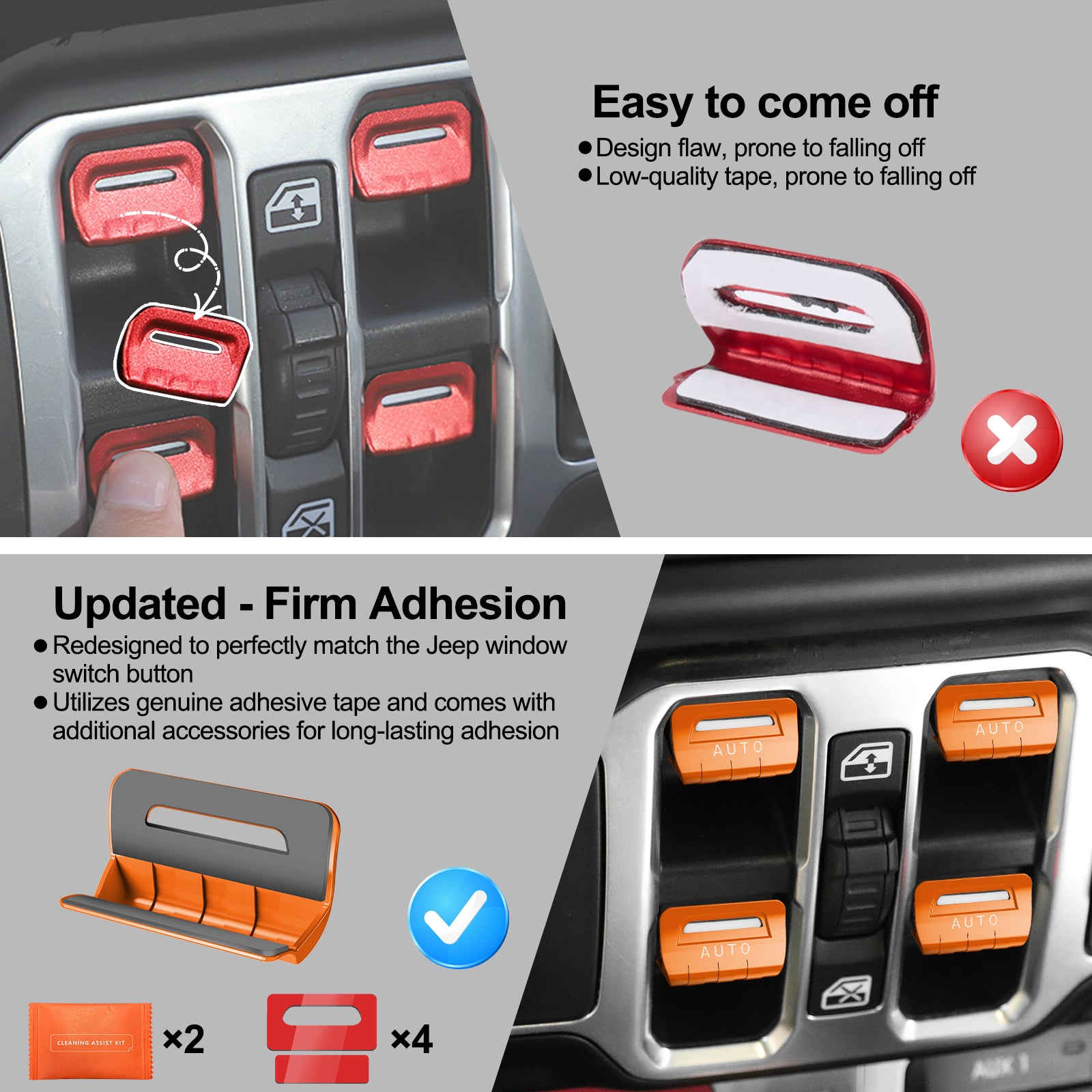 4.Package Contents: 4 center console window button switch covers, 4 foam adhesive tapes for switch cover backs (replacement parts), 2 pack of cleaning wipes. If there is any problem with our products, please let us know promptly.