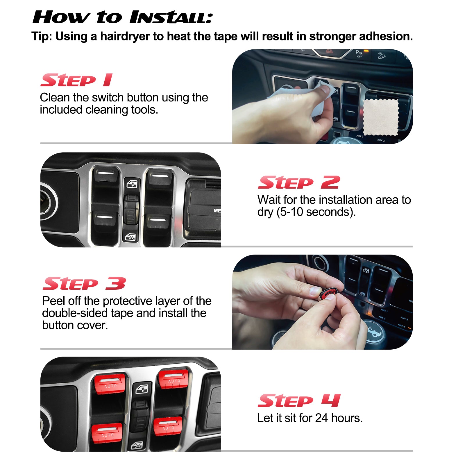 Compatible with Jeep Models: DIAMOOKY Window Switch Button Covers fit the following models- Jeep Wrangler JL/JLU (2025/2024/2023/2022/2021/2020/2019/2018) Jeep Gladiator JT (2025/2024/2023/2022/2021/2020 models) Perfectly fits your Jeep Wrangler accessories and Jeep Gladiator accessories.